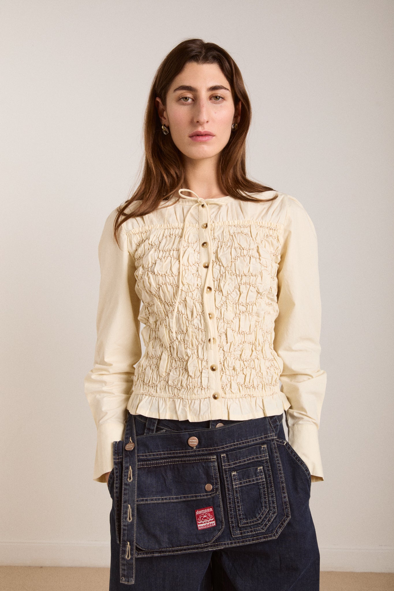 Meet your new everyday statement piece. Crafted from 100% organic cotton, this blouse features a beautifully smocked bodice that creates a flattering, fitted silhouette. A soft crew neck is finished with a delicate tie detail, while a full button-down placket and cuff buttons add refined structure.