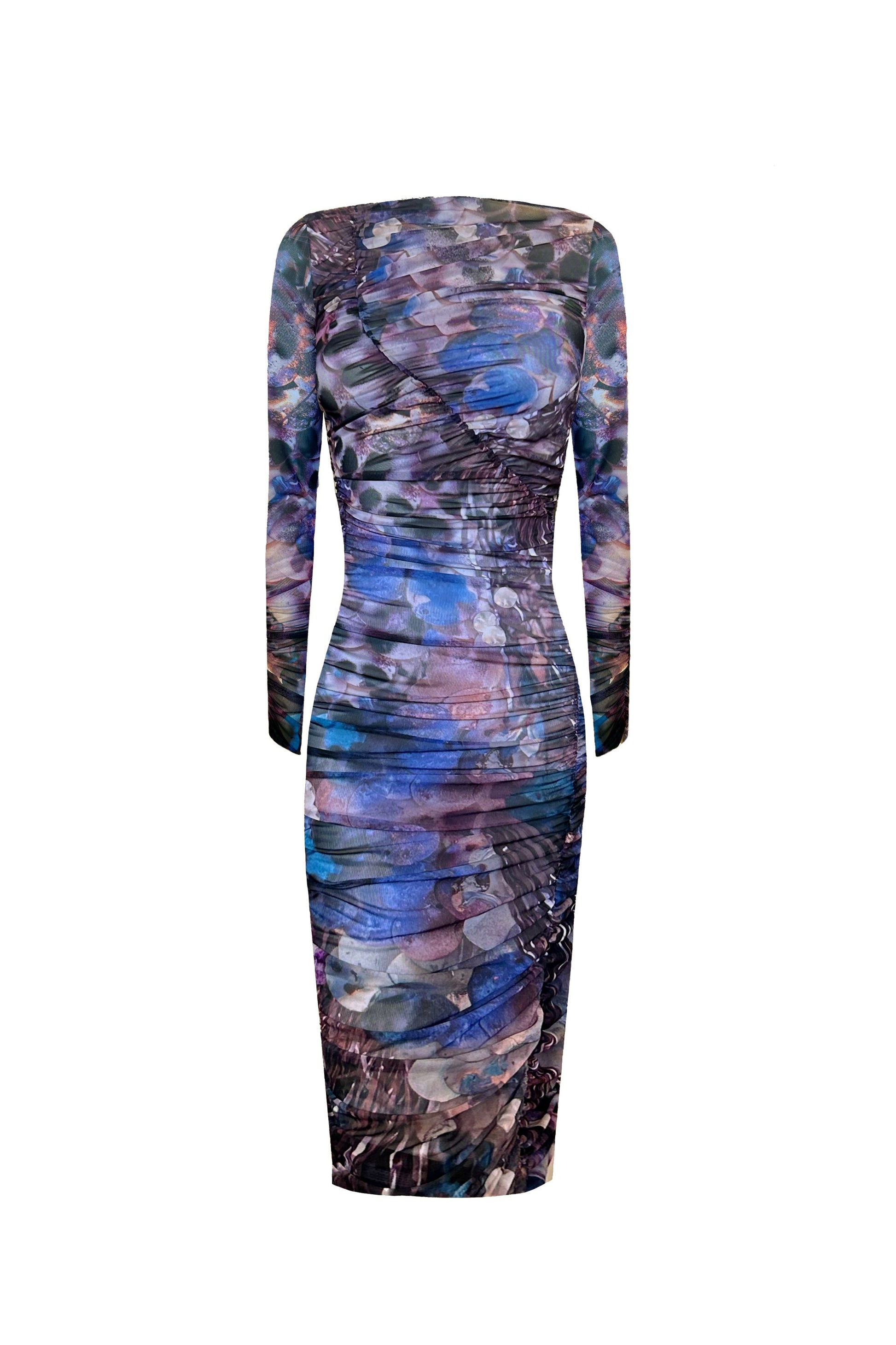 The wave dress is a figure hugging statement dress with ruched details that accentuates the female form.