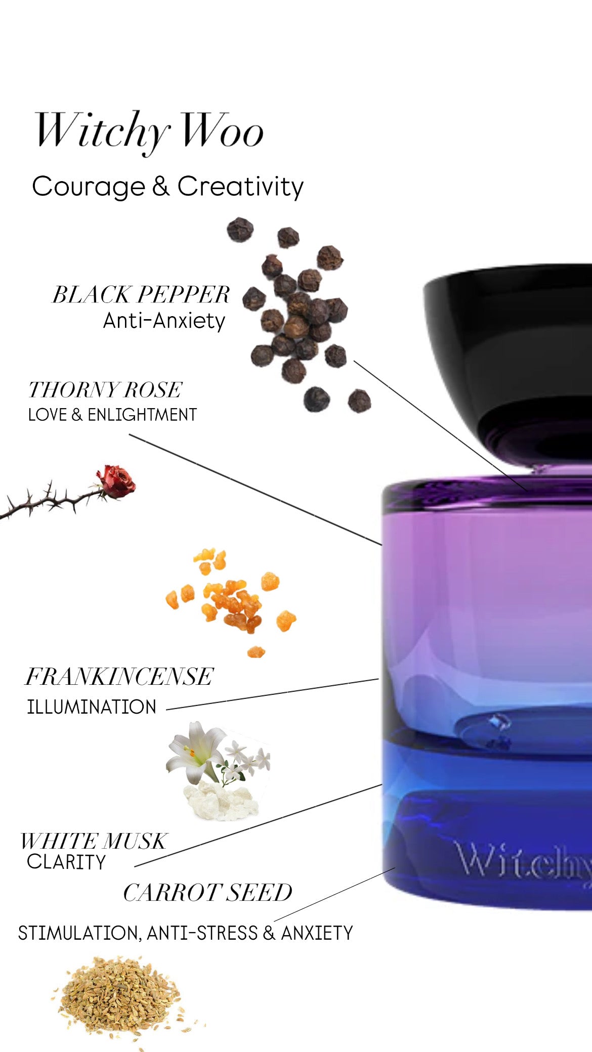 Deep, earthy, rare Moroccan orris absolute casts the spell of Witchy Woo. Orris entwines thorny rose, nutmeg, cinnamon and black pepper with grounding patchouli and wraps it in illuminating frankincense and opoponax with musk to seal. Wake up the powerful alliance of your courage and creativity.