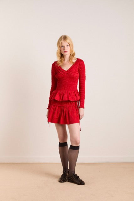 Cherry red perfection, our Charli Mini Skirt is this season's stand-out style. Crafted from 100% organic cotton, featuring a drop waist with functional tie detailing. Wear with our matching Suri Shirred Blouse for ultimate impact.