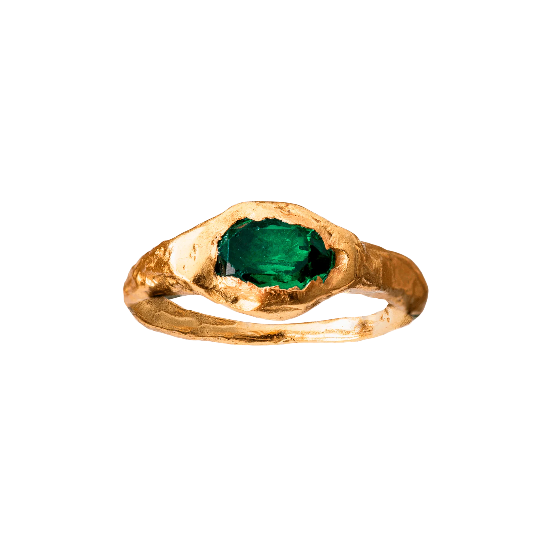 Faro Green, handmade gold plated recycled silver ring with green emerald Cz stone.