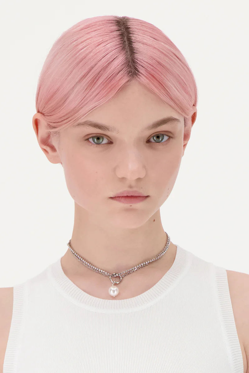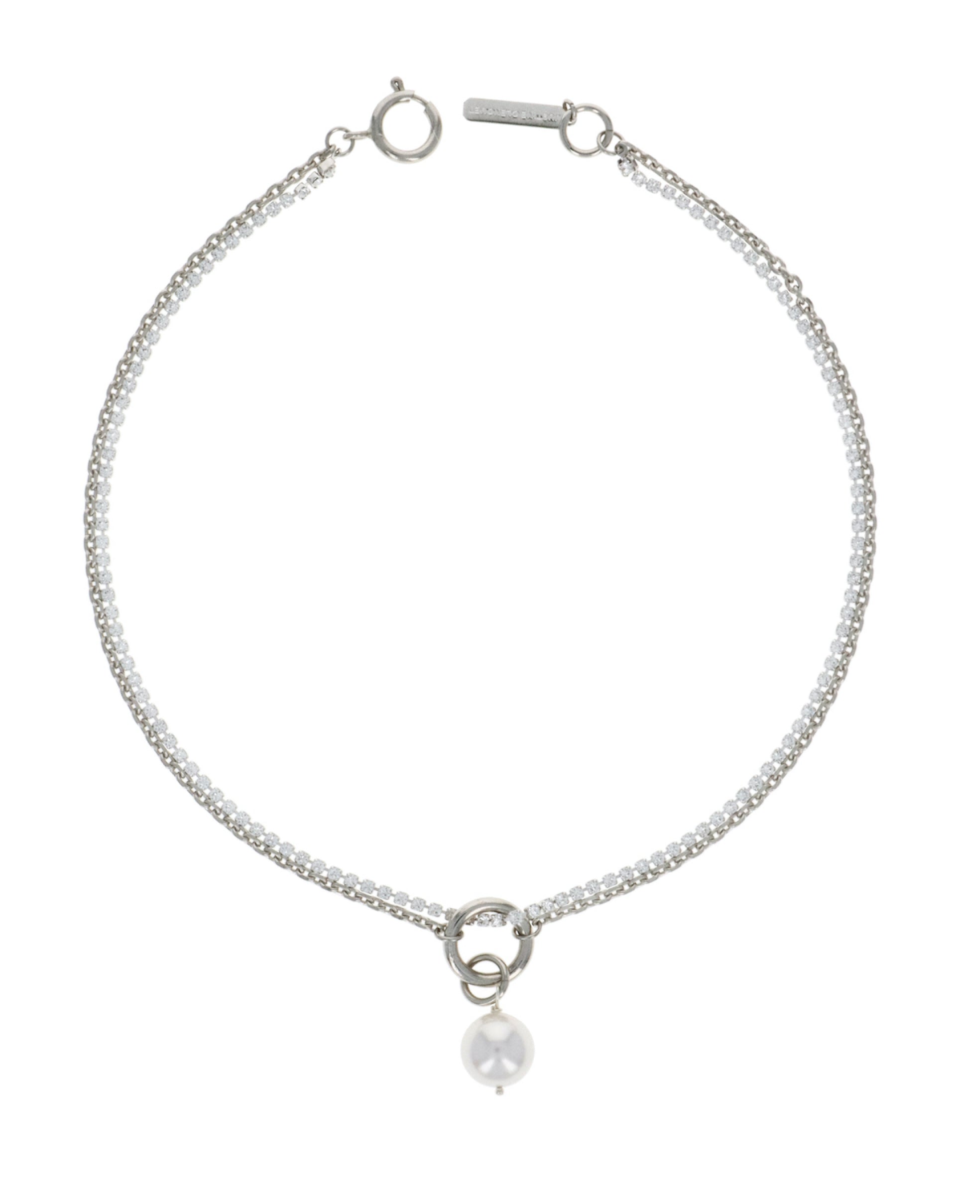 An off-white crystal pearl hanging from an o-ring hardware in the middle of the necklace, for an extra touch of flair.