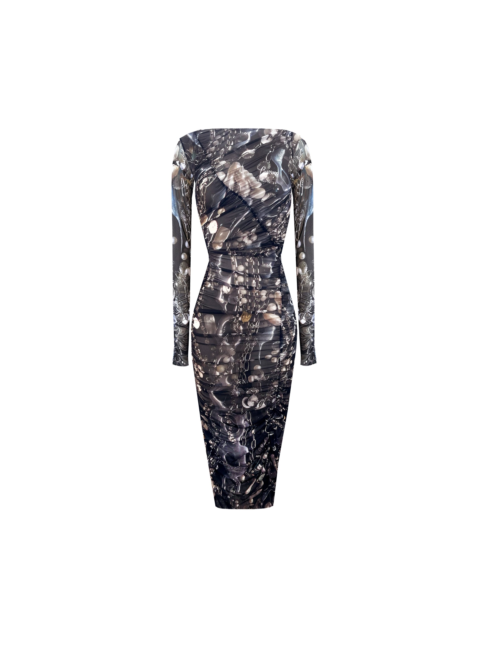 The Wave Dress is a form-fitting, ruched dress that highlights the female figure. Each piece is unique due to the differently placed print, and it fits true to size. Made from sheer mesh, the dress is slightly see-through, adding an alluring touch.
